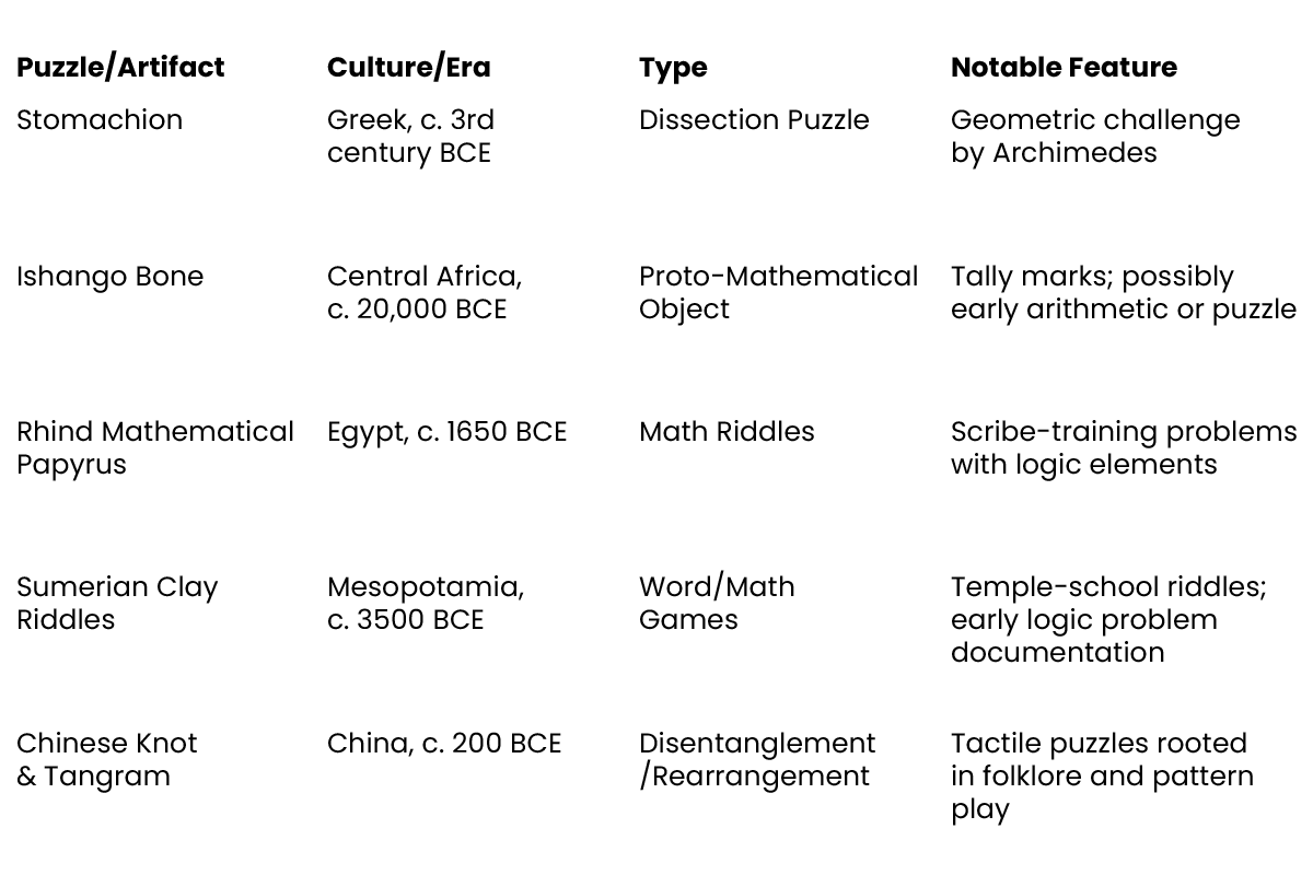 Riddles, mathematical problems, and physical puzzles such as knots and dissection shapes were common across Mesopotamia, Egypt, Greece, and China.